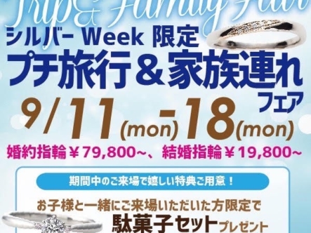 シルバーWeek限定!関西へのプチ旅行&家族連れの方へおすすめフェア開催! 結婚指輪29,000円~・婚約指輪79,800円~ プロポーズプラン¥29,800~ 9月といえば、シルバーウィーク!今年は旅行に出かける方も多 … 続きを読む シルバーWeek限定!関西へのプチ旅行&家族連れの方へおすすめフェア開催!9/11~9/18まで