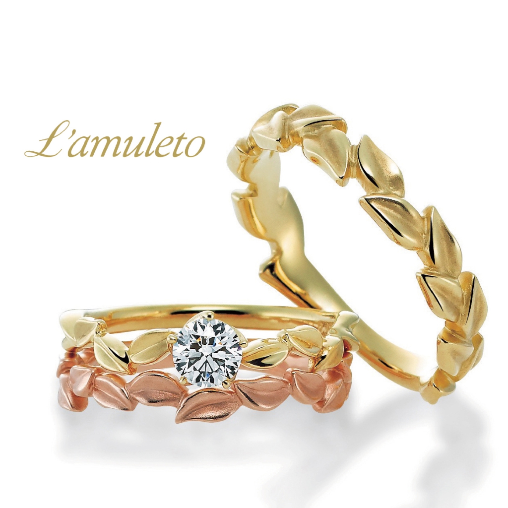 ゴールドの繊細な葉のモチーフがダイヤモンドを際立たせ、可憐な印象のリングに仕上げています。
