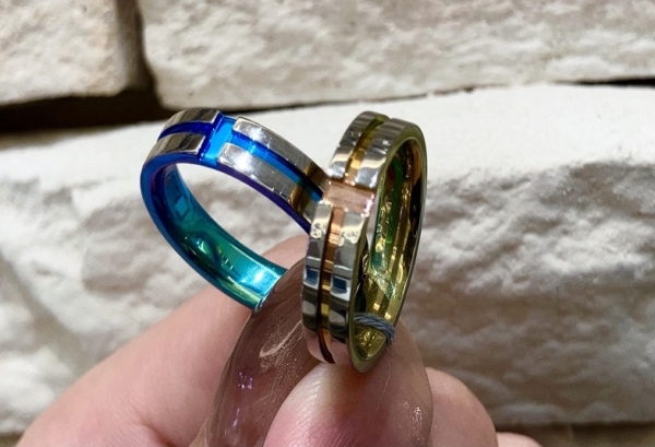 チタンは表面の酸化皮膜によって、様々な色を作り出すことが可能です。焼き色をつけることによって鮮やかなアクセントカラーやグラデーションカラーを作れます。さらにはつや消しや鏡面仕上げなど様々な加工を施すことが出来ます。プラチナやゴールドなどの単色の結婚指輪にはないオリジナリティあふれる結婚指輪が欲しいという方にお勧めです。