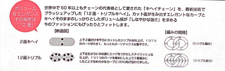 ひとつのコマに3つのコマが連なるトリプル編みのチェーンで、断面を見ると上下に2面、左右に6面のカットが施されています。コマ同士が密接しているため、表面は滑らかで美しく、華やかな輝きがファッションのアクセントとして映えます。
